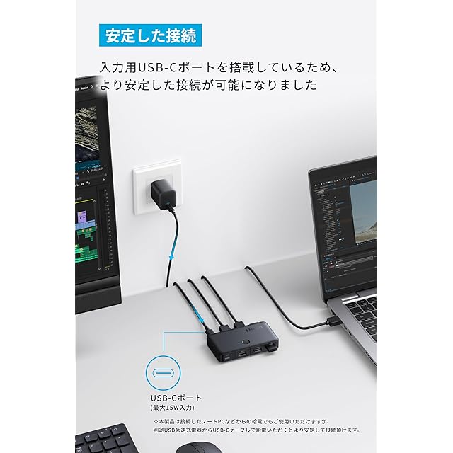 安定した接続:入力用USB-Cポートを搭載しているため、より安定した接続が可能になりました。 ※本製品は接続したノートPCなどからの給電でもご使用いただけますが、別途USB急速充電器からUSB-Cケーブルで給電いただくとより安定して接続頂けます。