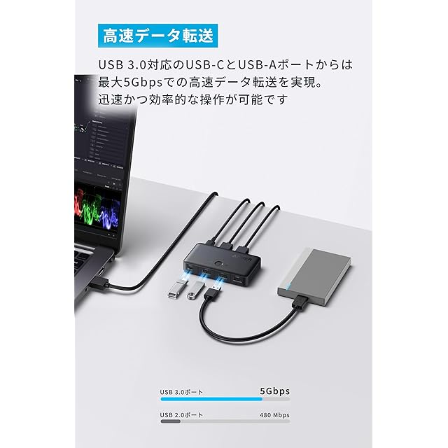 高速データ転送:USB 3.0対応のUSB-CとUSB-Aポートからは最大5Gbpsでの高速データ転送を実現。迅速かつ効率的な操作が可能です。