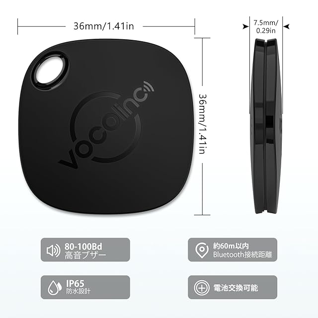 <b>「スマートタグ」―VOCOlinc </b><br>・対応機種: iPhone・iPadに対応(iOS14.5以上システムに全部対応できるKey finderです。<br>・ サイズ:36* 36*7.5mm <br>・重量:11g <br>・ 付属品:本体*2,CR2032電池(内蔵)*2,説明書*1 <br>機能性:<br>リマインダーの忘れ物 <br>Appleの「Find My」アプリで「忘れ物通知」をオンにします。スマホから「呼び出す」のコマンドを送信したら、レシーバーが大きい80dB+ビープ音を鳴らして振動します。音に追跡して迅速に紛失したアイテムを見つけられます。<br>アイテムが放棄され、AppleデバイスのBluetoothから切断された場合、「Apple Find My」アプリがすぐに追加費用なしで通知を送信します。<br>過去の位置情報<br>Bluetoothの圏外では、アプリ「Find My」がVOCOlincタグの履歴位置をマークするので、その場所に戻って地図から紛失物を見つけることができます。<br>IP67の耐水性<br>3000回以上のテストにより、汗、水、雨に強いです。<br>交換電池可能<br>★CR2032コイン型電池を採用。<br>★コイン電池の寿命は1年です。