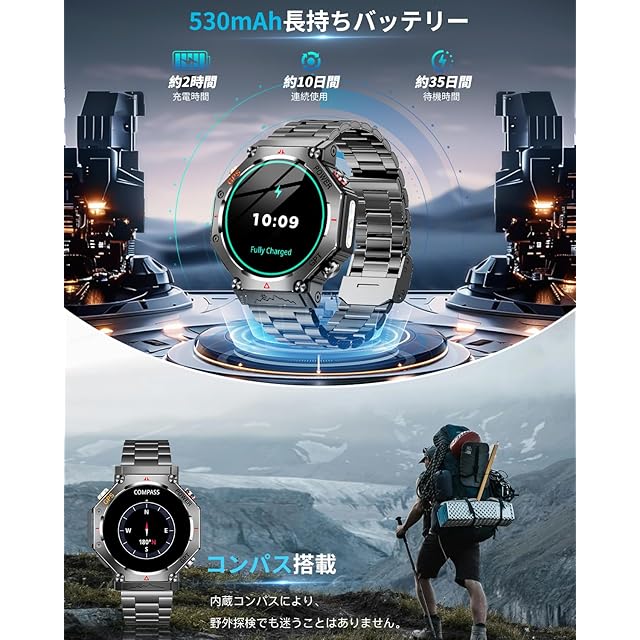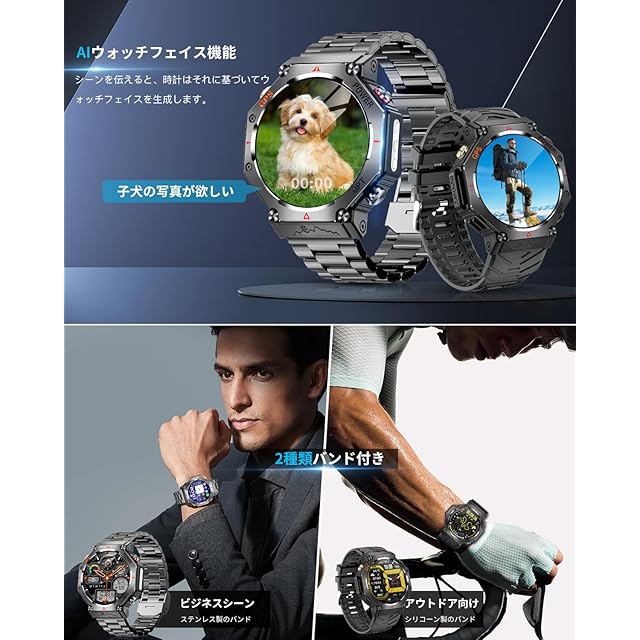 【軍用規格スマートウォッチ&1.39インチ大画面& CHATGPT搭載】スマートウォッチは特殊な複合材料を採用され、耐低温、耐高温、耐衝撃、防水防塵など、多くの軍用標準テストに合格することができます。スポーツウォッチは、間違いなく野外活動のようなときにあなたの信頼できる仲間になることができます。Smart watchの画面は耐衝撃性のガラスが採用するため、耐久性と傷がつきにくくなっています。日常から過酷な自然環境まで、あらゆるシーンで適用されます。1.39インチのカラースクリーンを搭載され、360×360ピクセル高解像度で、太陽光の40%を反射する性質があり、大きなフォントで屋外でも老眼の方でも情報やデータが見やすく表示されます。業界最新のChatGPT搭載し、自然言語で質問するだけで、専門的な回答をいつでも提供します。例えば対応ソフトを起動し「ヘルシーな食事プランが欲しい」と話しかければ、外出中やPCが手元になくても即座に回答を取得可能です。