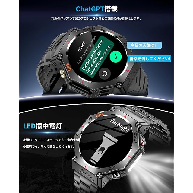 商品名:スマートウォッチ【2025年業界新登場 ChatGPT搭載】高輝度懐中電灯 軍用規格 Bluetooth5.3通話 スポーツウォッチ 3ATM防水 耐衝撃 GPS運動軌跡記録 腕時計 長持ちバッテリー 100+運動モード DIY文字盤 高度計 気圧計 コンパス Lineなどアプリ通知 歩数計 iPhone アンドロイド対応 日本語説明書