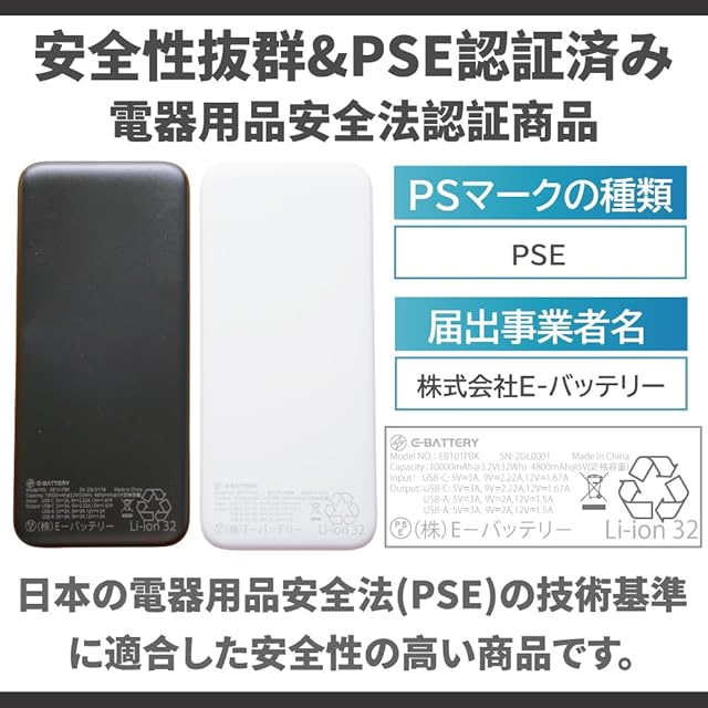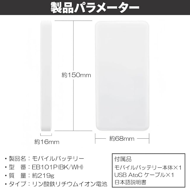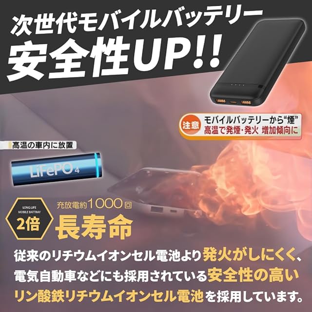 商品名:モバイルバッテリー リン酸鉄 10000mAh 急速充電 PD20W 電気自動車電池採用 燃えにくい 薄型 Type-C×1 USB-A×2 PSE認証済 高い安全性 長寿命 パススルー 機内持ち込み可能(ホワイト)
