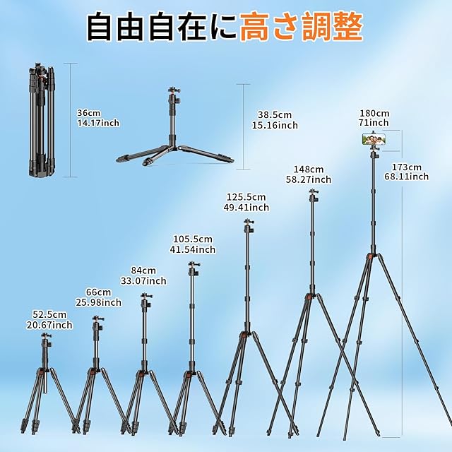 180cmまで調整可能&携帯便利:一眼レス三脚は、3つのセクションの伸縮式センターポールと3段階伸縮可能な3脚を備えており、高さは最大180cmまで自由に調整可能です。逆折れ収納設計で、収納時はわずか36cmのコンパクトサイズを実現。収納ケース付きなので、総重量1.03kgで利便性が抜群。実用性に優れ、見た目もかっこいい旅行三脚です。星空、夜景、花火、運動会、運動会 登山、などの様々撮影に大活躍。