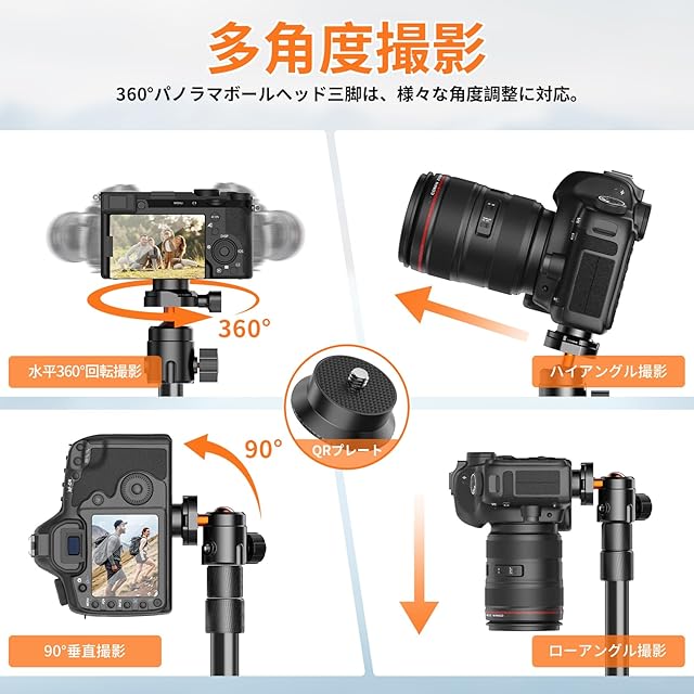 360°パノラマ自由ボール雲台:三脚の角度を360°自由に調整でき、より自然な構図で写真を撮影できます。ボールとU字型の溝の設計により、360度水平と90度垂直の角度撮影を簡単に切り替えられます。さらに、クイックシューは、1/4インチネジ付きプレートで、ほとんどの一眼レフカメラやビデオカメラに対応しています。雲台のサイドには1/4インチネジ穴があり、撮影のニーズに応じて様々な写真補助機器を接続できます。