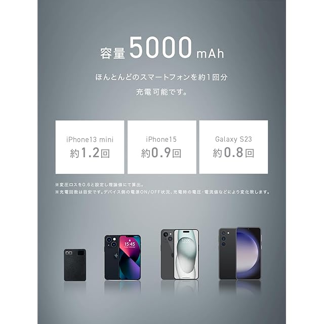 【コンパクトで軽さ約108g】クレジットカードとほぼ同じサイズ(約60.8mm×約88mm)のコンパクトさで、約108gという驚きの軽さ。スマートフォン(iPhoneやGalaxy、Xperia等のAndroidスマホ)と重ね持ちした際も、スマホカメラに干渉しづらいサイズ感で、長時間の重ね持ちでも重さの負担がかかりにくい重量です。