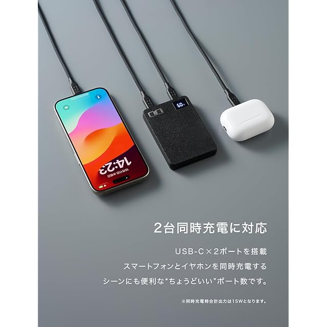 【2ポート搭載】USB-Cポート×2の充電口を搭載。 様々な用途の充電が可能となり、充電しながらiPhoneやAndroid等のCポートが必要なデバイスを充電したりと、お持ちのデバイスやケーブル状況にあわせた充電が可能となります。