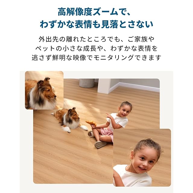 高解像度ズームで、 わずかな表情も見落とさない : 外出先の離れたところでも、ご家族や ペットの小さな成長や、わずかな表情を 逃さず鮮明な映像でモニタリングできます