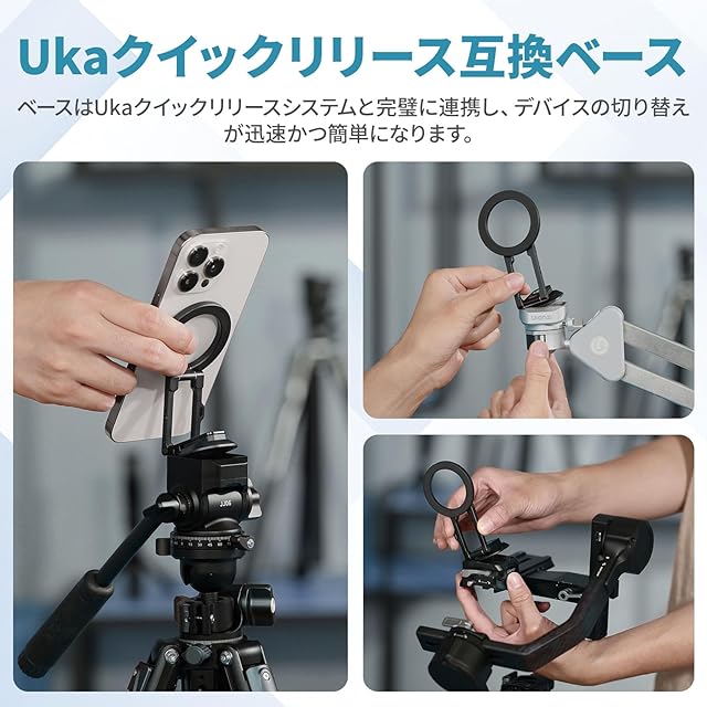 【UKAクイックリリース対応と1/4ネジ穴付き】スマホホルダーは底部に1/4ネジ穴を装備しており、三脚や雲台、ライトスタンド、自撮り棒などに取り付けて撮影することができます。また、当社のUKA生態製品に対応します。UKAクイックリリースプレートベースを搭載する三脚やライトスタンドに素早く直接取り付け・取り外しすることが可能です。また、ライブ配信、動画撮影、自撮り、風景写真になど様々なシーンで使用できます。
