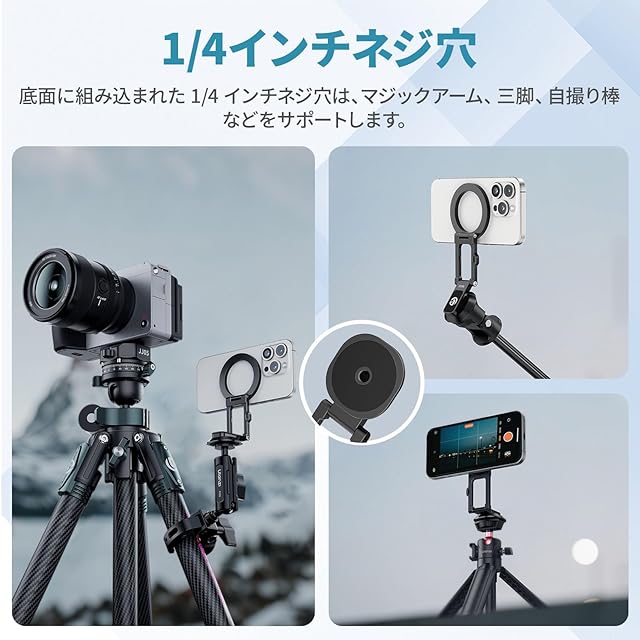 商品名:Ulanzi MA50 スマホホルダー magsafe用 三脚マウント Ukaクイックリリース対応 両面マグネット 超强磁力 アルミ合金 マグセーフ用リング スマホスタンド 1/4ネジ穴 3脚用アダプター 角度調整 薄型 折りたたみ式 軽量 iPhone 17 16 15 14 13 12/三脚/自撮り棒/Uka製品に